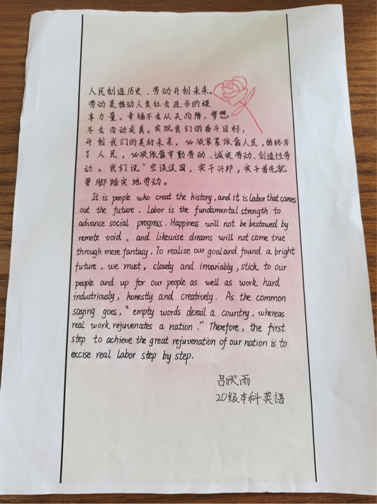 吕欣雨翻译了“人民与劳动”选段,人民群众是历史的创造者,我们党的历史就是一部党与人民心连心、同呼吸、共命运的历史。劳动是推动人类社会进步的根本力量,劳动创造幸福,实干成就伟业。应当以人民为中心,为人民谋幸福。