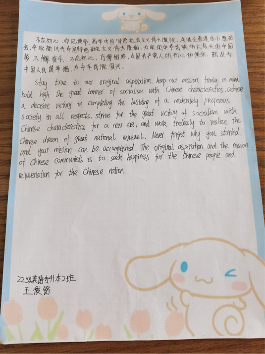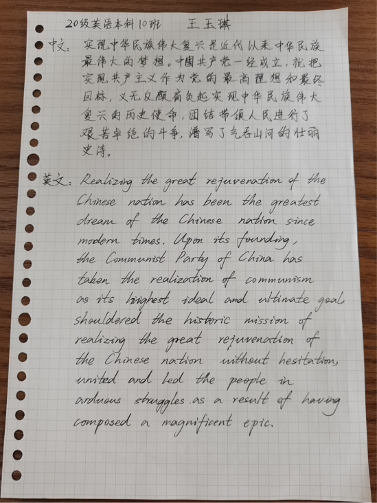 王俊铭选译了“中国梦”部分,要实现中国梦就必须坚持中国共产党领导,时刻高举中国特色社会主义伟大旗帜,全面贯彻习近平新时代中国特色社会主义思想,为全面建设社会主义现代化国家、全面推进中华民族伟大复兴而团结奋斗。