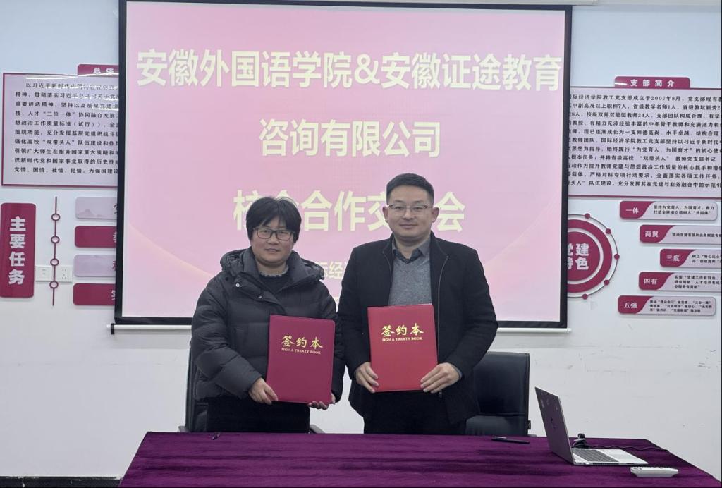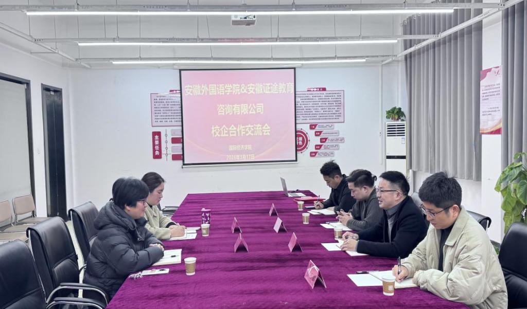 为进一步拓宽毕业生就业渠道,搭建校企协同育人平台,3月17日下午,安徽证途教育咨询有限公司总经理赵斌一行莅临我校,就深化校企合作、拓展就业岗位、共育高素质人才进行深入交流,并成功签署校企合作协议。国际经济学院党总支书记、执行院长高淑香,党总支副书记彭丽萍出席本次交流会及签约仪式。
