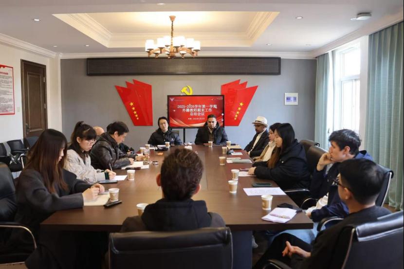 2026年1月12日,我校在行政楼216会议室召开了2025年度外籍教师工作总结会议。会议由国际交流处处长黄圣炯主持,全体在校外籍教师及国际交流处工作人员出席会议。