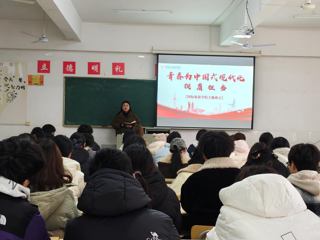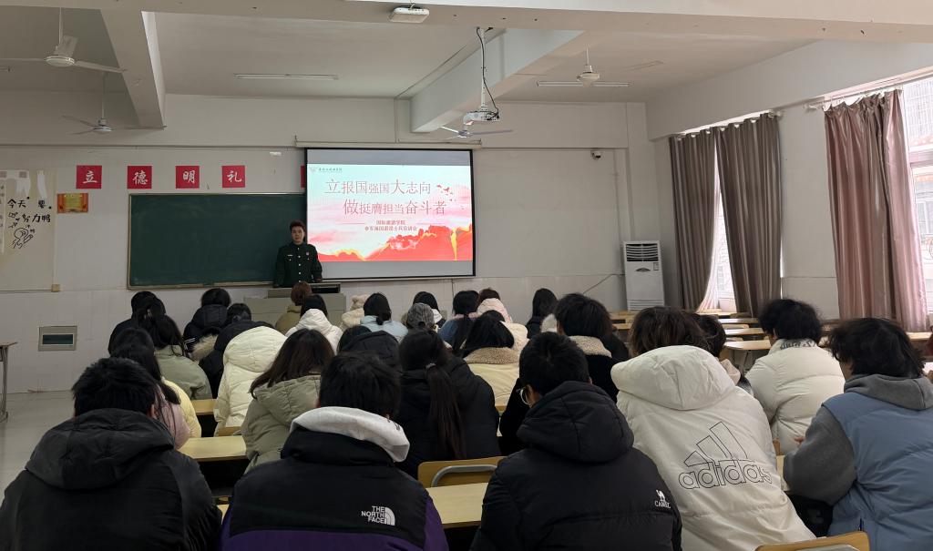 为引导青年大学生坚定理想信念,明确时代责任,将个人成长融入中国式现代化建设大局,同时强化日常管理与价值引领,12月24日下午,国际旅游学院在国旅211教室召开“立报国强国大志向,做挺膺担当奋斗者”系列主题活动。国际旅游学院辅导员夏文清主持活动,助理辅导员雷婉婷和退役士兵付延成及25级旅游管理(对口)2班全体同学参与。