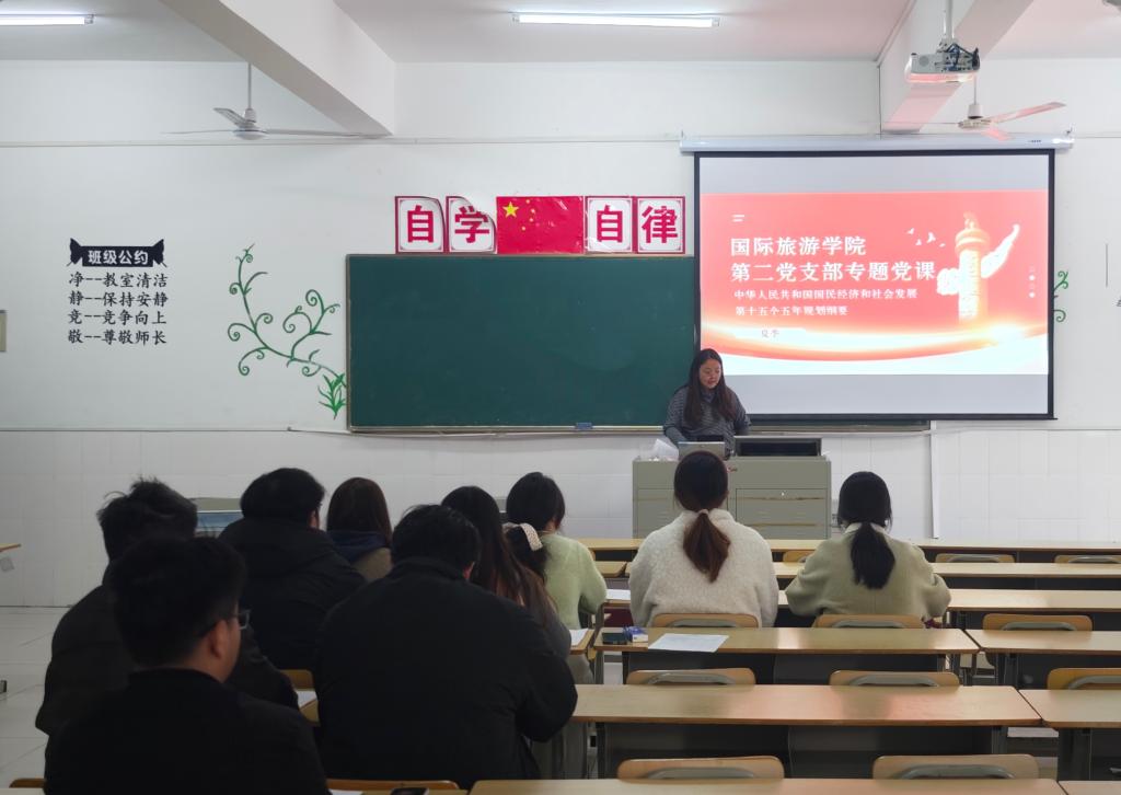 为深入贯彻落实国家战略部署,进一步提升党员队伍的政治素养与专业认知,3月25日,国际旅游学院第二党支部在学院会议室举行专题党课学习活动。本次活动以《学习研读国家“十五五”规划纲要,聚焦旅游行业高质量发展》为主题,支部全体党员参加学习并展开深入研讨。
