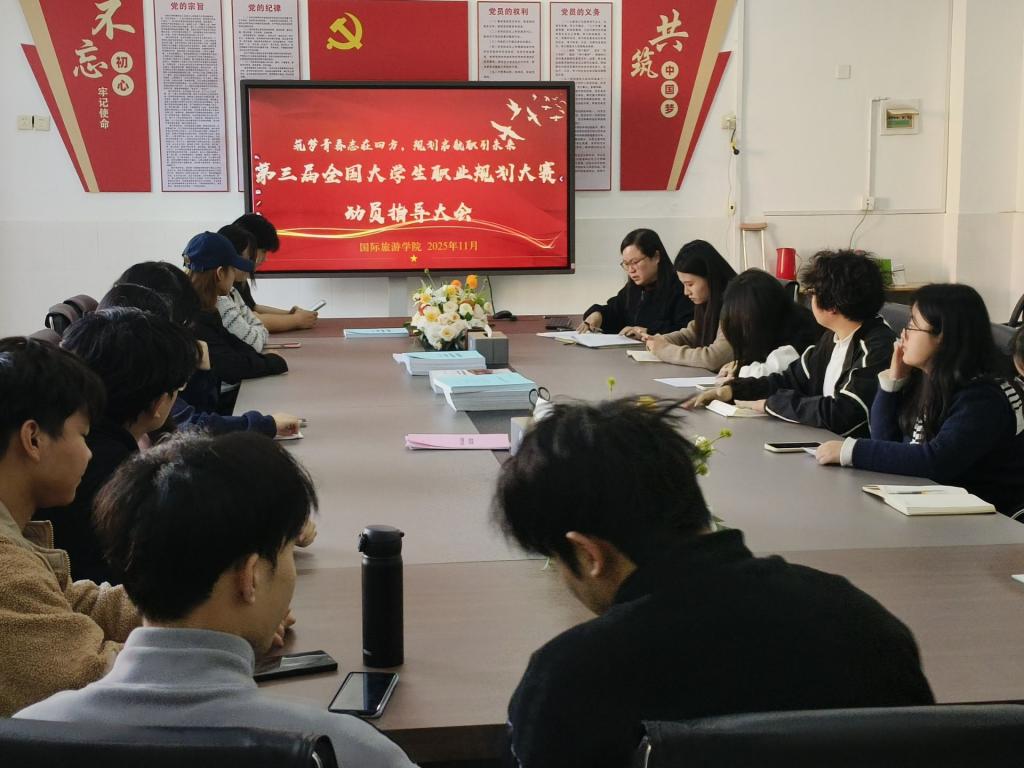 为深入贯彻落实国家就业优先战略,引导学生树立科学职业规划意识、提升职业发展核心能力,11月11日下午,国际旅游学院在文传310会议室召开第三届全国大学生职业规划大赛动员指导大会。学院党总支副书记满德慧主持会议,团总支书记陈佳妮及全体学生干部参会。
