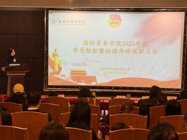 为总结2025年度学生组织与社团工作成果、梳理不足、明确方向,12月30日,我校国际商务学院在图书馆放映厅召开年度学生组织暨社团年终述职大会。学院党总支副书记何文翔,团总支书记余涵,教师代表,各学生组织及社团代表、学生代表参会。