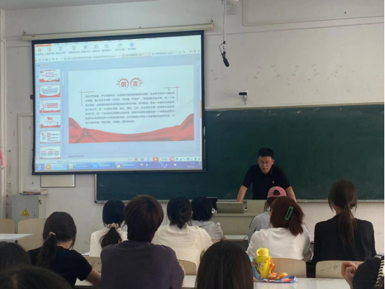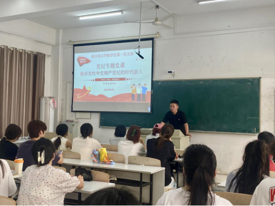 为进一步推动党纪学习教育,深入贯彻落实全面从严治党要求,强化党员纪律意识和规矩意识,筑牢廉洁自律的思想防线,2024年6月12日,西方语言学院学生第一党支部在西语204教室开展“做‘讲党性守党规严党纪’的时代新人”党纪学习教育专题党课,由学生第一党支部书记胡礼盼授课,支部全体党员参加。