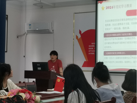 为扎实开展党纪学习教育,引导师生党员学纪、知纪、明纪、守纪,不断增强纪律意识,提高党性修养,西方语言学院党总支于2024年6月17日12:00在西语301党员活动室,开展党纪学习教育专题党课,由党总支副书记张海清主讲,学院全体师生党员参加。