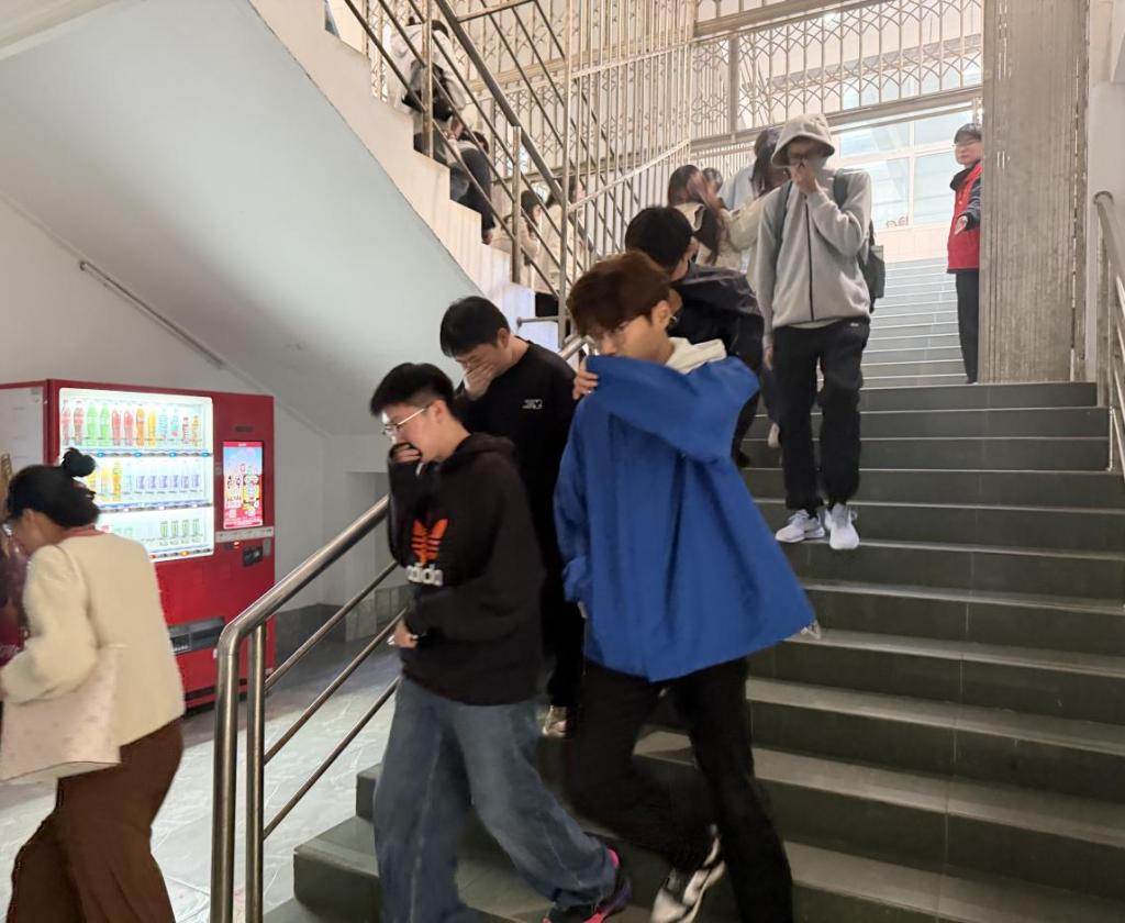 在疏散引导人员的沉着指挥下,参演师生们反应迅速,用湿毛巾捂住口鼻,弯腰低姿,按照预定疏散路线,快速而有序地从教学楼西侧经四教向集结地点驾校空地撤离。整个疏散过程紧张而不慌乱,高效且有条不紊,所有参演人员均在规定时间内安全抵达指定区域,展现了良好的应急反应能力。