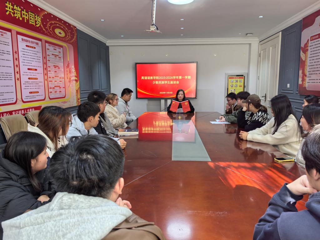为深入学习贯彻习近平总书记关于加强和改进民族工作的重要思想,铸牢中华民族共同体意识,切实关心少数民族学生在校学习生活与成长发展,11月24日中午,英语语言学院于西语101会议室召开2025-2026学年秋季学期少数民族学生座谈会。党总支副书记韩璐与来自回族、满族、土家族、维吾尔族、布依族的18名少数民族学生围坐一堂,共话成长,共叙情谊。