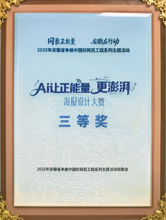 近日,由安徽省委网信办、省教育厅、省总工会、团省委、省妇联联合主办的“网聚正能量 安徽在行动” 2025年安徽省争做中国好网民工程系列主题活动之“AI让正能量更澎湃”海报设计大赛公布获奖名单。我院产品设计专业学生张仕锦在老师潘冰莹、班落敏的指导下,凭借作品《皖中正气·净网心安》从全省1900余家单位、42.5万余名参与者的2.3万件作品中,获安徽省三等奖。