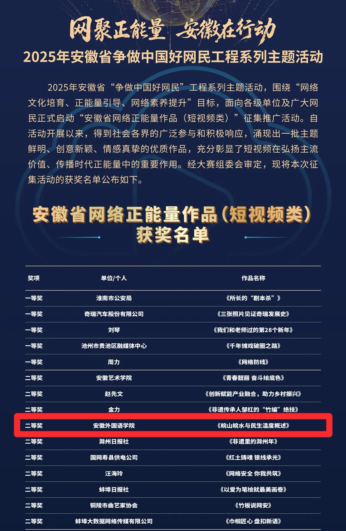 近日,由省委网信办、省教育厅、省总工会、团省委、省妇联联合主办的“网聚正能量 安徽在行动”2025年安徽省争做中国好网民工程系列主题活动获奖名单公布。英语语言学院2025级本科生王婧短视频作品《皖山皖水与民生温度概述》获评“安徽省网络正能量作品”二等奖。