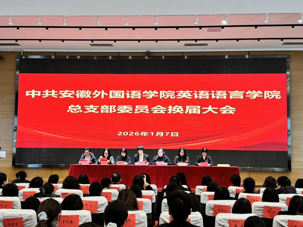 在全党上下深入学习贯彻落实党的二十届四中全会精神,全面推进学校高质量发展之际,1月7日下午,中共安徽外国语学院英语语言学院总支部委员会换届选举大会在圆形报告厅召开,大会主要任务是总结2021年1月换届以来的工作,明确发展思路,选举产生新一届总支部委员会。校党委组织部部长助理詹凤芝、英语学院党政班子、全体党员参会,会议由党总支副书记韩璐主持。