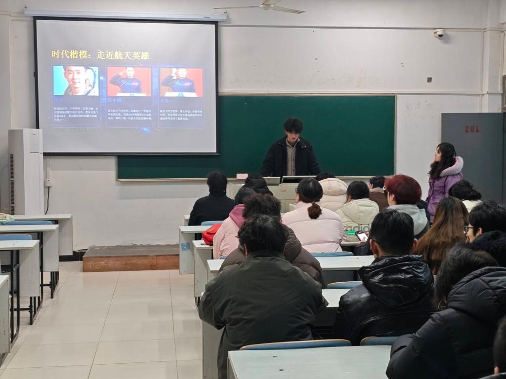 班会上,孙文带领学生们回顾了我国两弹一星事业的辉煌历程和载人航天的伟大成就,组织学习《中共中央国务院中央军委关于给陈冬颁发“一级航天功勋奖章” 授予陈中瑞、王杰“英雄航天员”荣誉称号并颁发“三级航天功勋奖章”的决定》,他强调,“两弹一星”精神和载人航天精神是中华民族自强不息、勇攀科技高峰的生动体现,是激励我们这一代人奋发向前的不竭动力。陆鑫雨带领学生们走近时代楷模——航天英雄,详细了解他们的主要事迹与成就、突出贡献与精神,深入解码载人航天精神的内涵,引导大家从英雄身上汲取信仰力量,勉励学生们要以航天精神砥砺自我,争做有理想、有担当的新时代好青年,将个人成长融入国家发展的浩瀚征程。