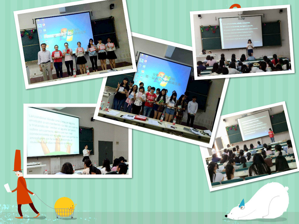 为了丰富学生的课余生活,激发学生的学习热情,5月20日下午,西班牙语专业学生欢聚一堂,在四号教学楼106多媒体教室举行了第一届西班牙语朗诵比赛。来自14级西班牙语专业1班、2班以及14级应用西班牙语专业1班、2班的共36名同学参加了比赛。此次比赛由西方语言学院西班牙语教研室主办,西班牙语优秀教师代表担任此次比赛评委,西方语言学院院长李永平亲临现场,观看比赛,为选手们鼓劲加油。