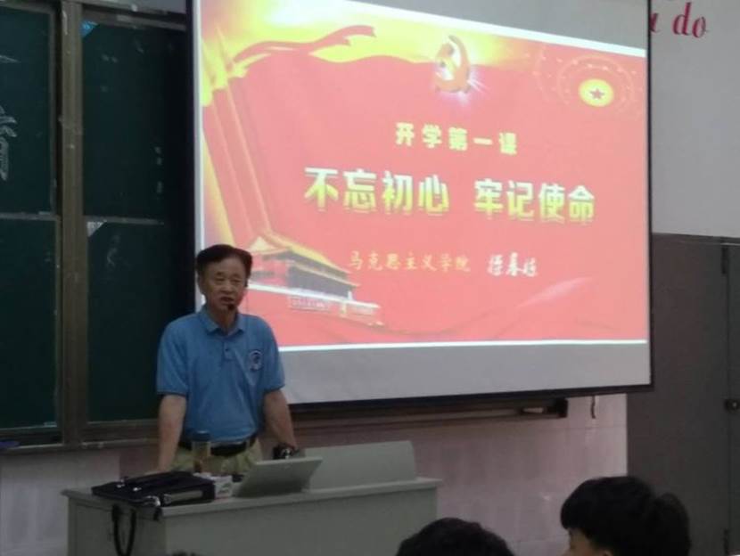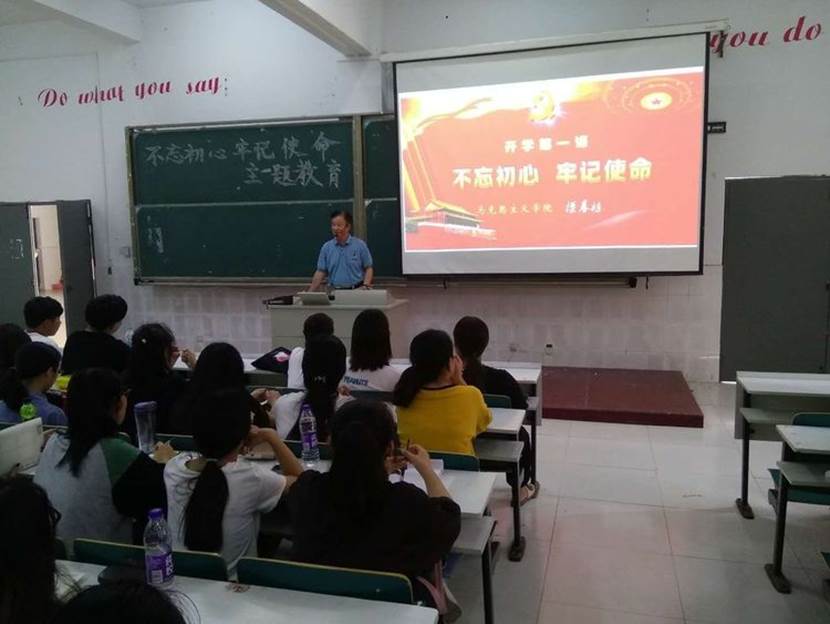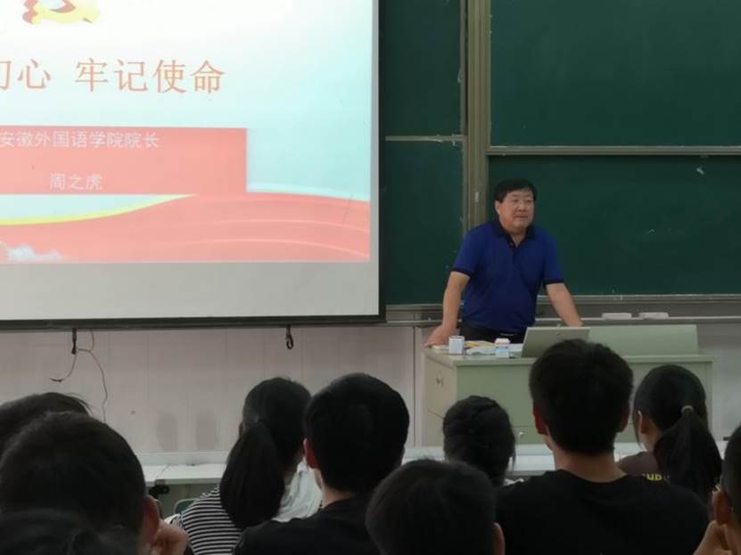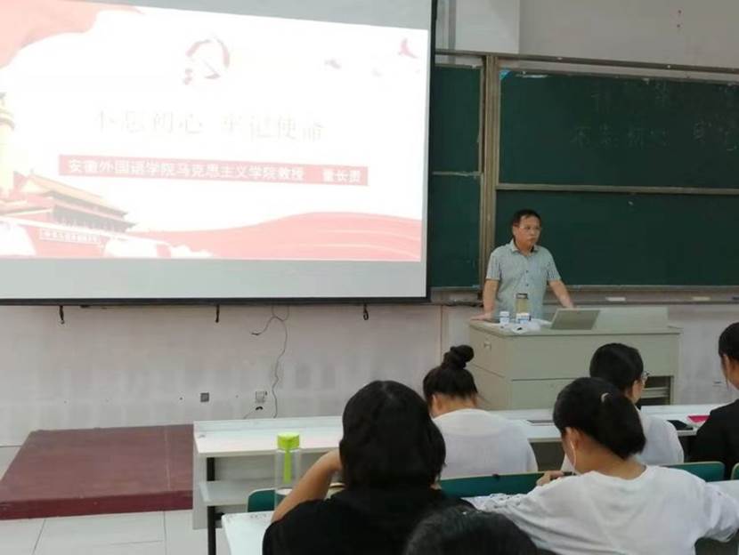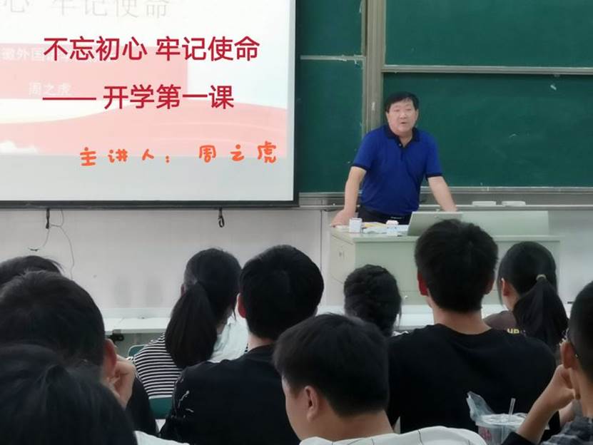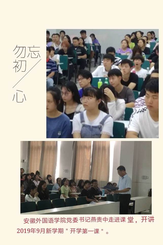 根据省委教育工委部署安排,2019年9月新学期,安徽外国语学院开展“开学第一课 ——不忘初心、牢记使命”主题教育。学校党委、校行政主要领导及马克思主义学院教授们走进课堂,为大一新生和大学生党员开讲“开学第一课”。马克思主义学院认真组织,集体备课,统一讲稿,统一课件,思政课教师在全院各教学班,讲好“开学第一课”。