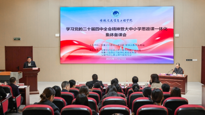 为深入学习贯彻党的二十届四中全会精神,推动大中小学思政课一体化建设向纵深发展,11月15日,由安徽文达信息工程学院与肥西县教体局联合主办、安徽外国语学院马克思主义学院等校协办的大中小学思政课一体化集体备课会在安徽文达信息工程学院文鼎楼五楼AI思政中心举行。我校马克思主义学院院长王有炜及概论教研室主任石玉娟受邀参会,与肥西县各中小学及相关高校思政教育工作者围绕教学创新路径与建设经验开展研讨交流。
