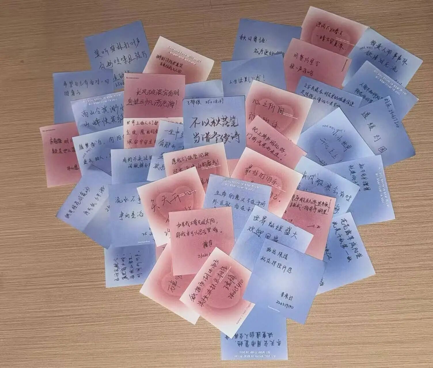 在“书写漂流”环节,同学们纷纷挥洒笔墨,将励志语录、生活感悟、诗歌短句等正能量内容倾注于便签之上:有人写下“在图书馆的晨光里,遇见更好的自己”,记录校园日常的小确幸;有人以“风过林梢,我们正当年少”传递青春朝气;还有人用短句诗歌描绘秋日校园的银杏与晚霞。写完后,随后开启的“阅读互动”环节,通过随机抽取便签的方式,让参与者与陌生人的文字展开“对话”——有人抽到暖心鼓励便签时露出笑容,有人对着诗意短句轻声品读,还有人主动与身边同样抽到便签的同学分享感悟,这种充满神秘感与期待感的互动形式,进一步增强了活动的趣味性和吸引力。