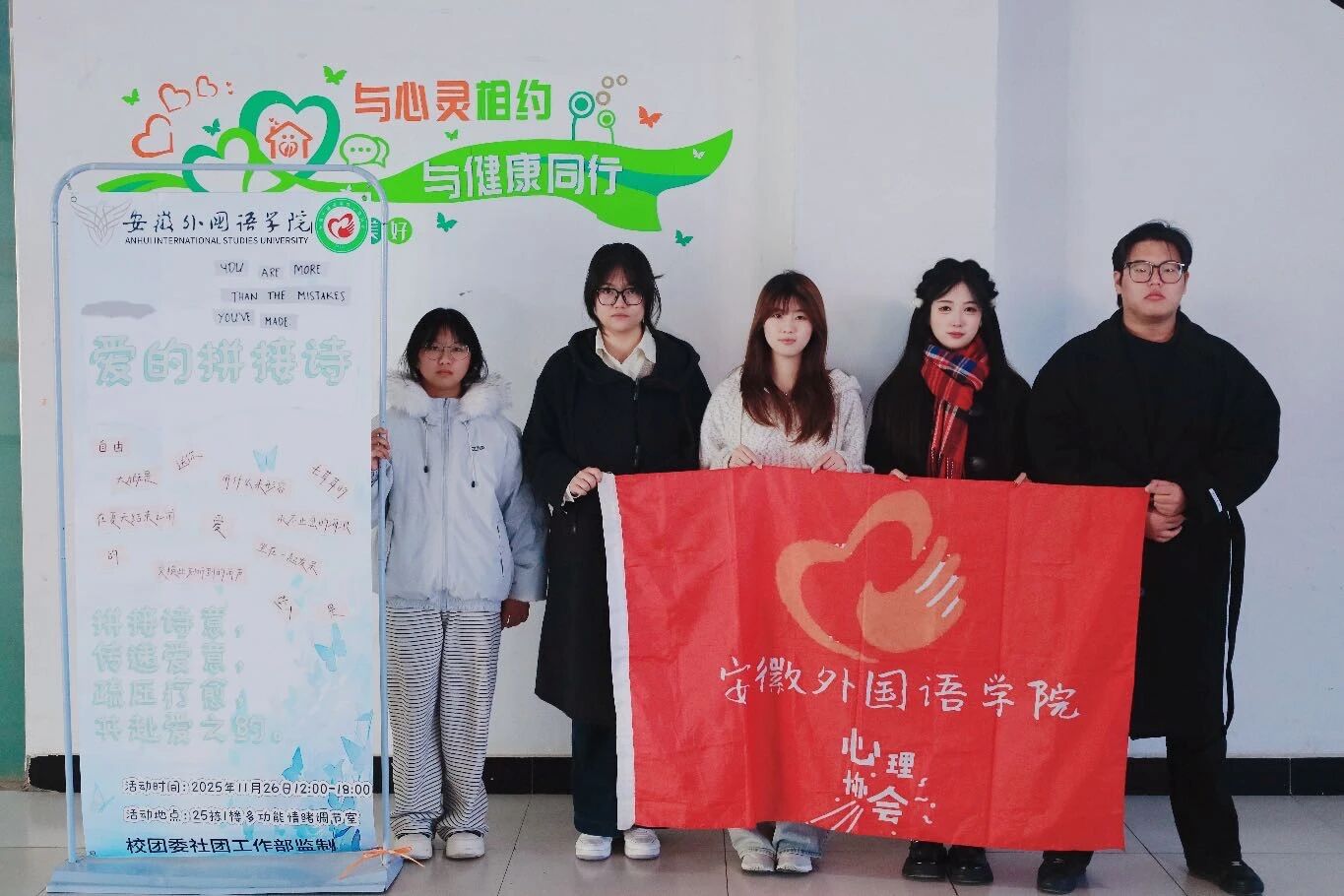 为了帮助学生在学业生活中找到情感表达出口,探索自我内心世界,通过诗意创作实现情绪疏导与自我疗愈,由安徽外国语学院学生处(心理健康教育与咨询中心)主办、校团委社团工作部承办、心理协会协办的“爱的拼接诗”心理主题活动在多功能情绪调节室成功举办。