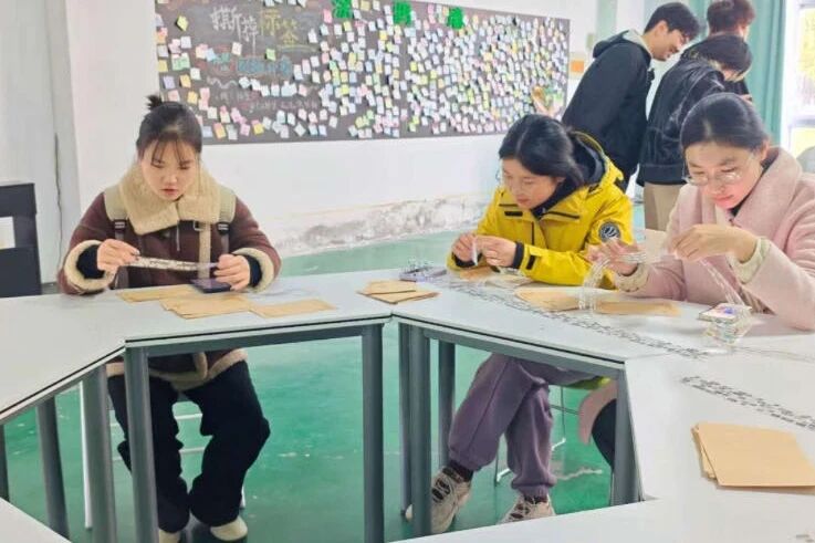 活动现场精心筹备了品类丰富的歌词主题贴纸与创作纸张,为同学们搭建起一片沉浸式的文字创作空间。创作过程中,大家充分发挥创意与巧思。有人小心翼翼揭下贴纸,在卡片上反复调整排布,将原本独立的文字符号重组为逻辑连贯、意蕴丰富的诗意表达;有同学沉浸于字句打磨,反复推敲语句间的韵律与节奏,力求呈现最精准的情感传递;也有同学主动与邻座交流灵感,在思想碰撞中完善作品;还有不少同学拿起画笔,以简约线条勾勒云朵轮廓,用细腻笔触描绘花草形态,或点缀几笔星光图案,让文字与画面相互映衬,为作品增添了浪漫雅致的艺术氛围。