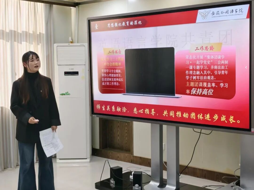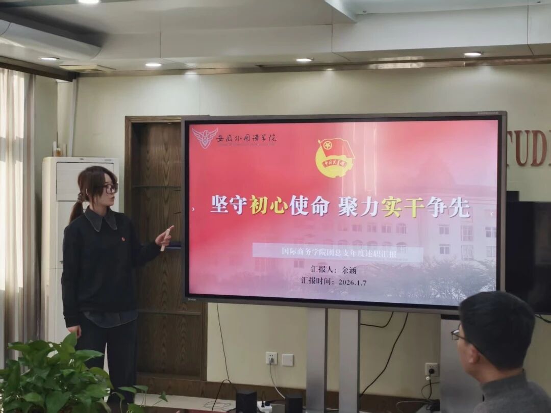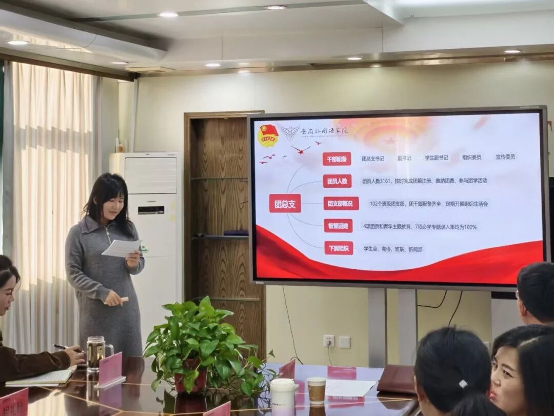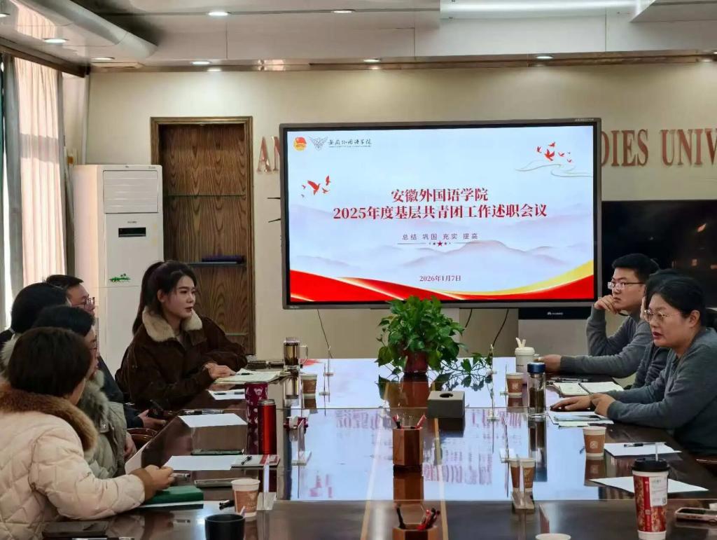 为深入贯彻团中央关于加强基层团组织建设的有关精神,扎实推进共青团改革,全面总结2025年度我校共青团工作,系统部署2026年团学工作重点,1月7日下午,安徽外国语学院2025年度基层共青团工作述职会议于行政楼207会议室顺利召开。校团委书记、挂兼职副书记、各二级学院党总支副书记、团总支书记出席会议。会议由校团委书记于焱主持。