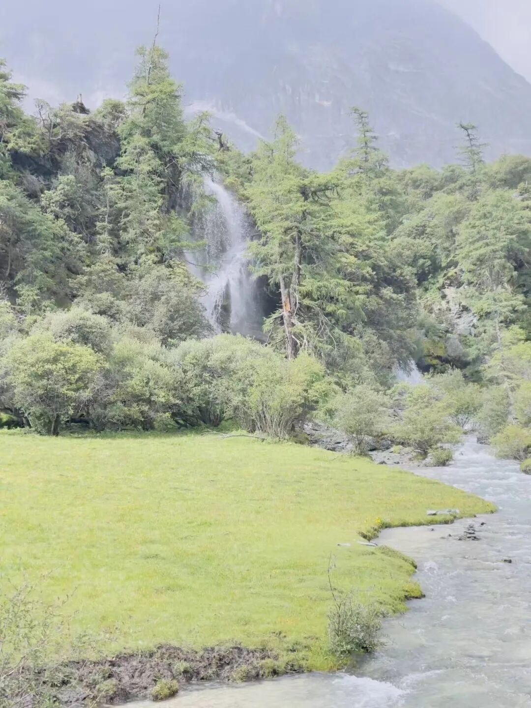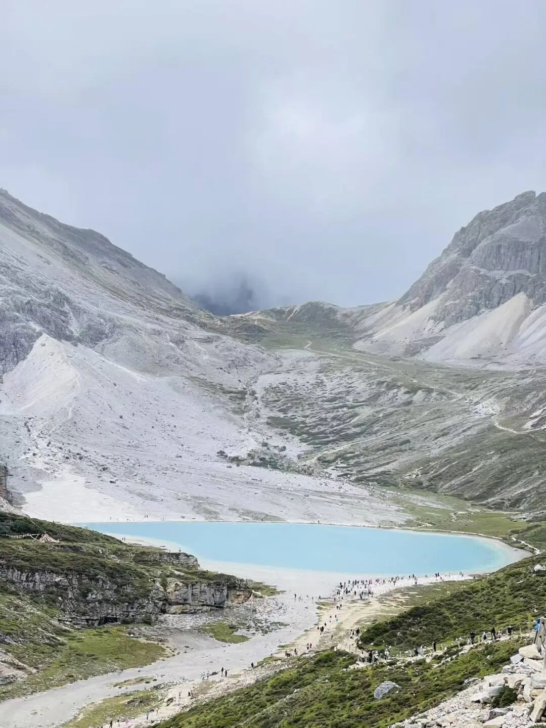 是在稻城亚丁的牛奶海旁看雪山倒映湖面