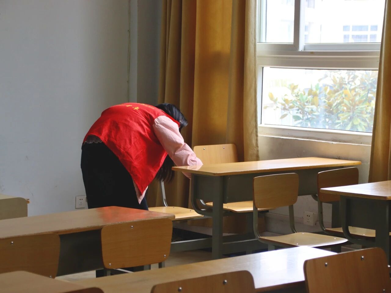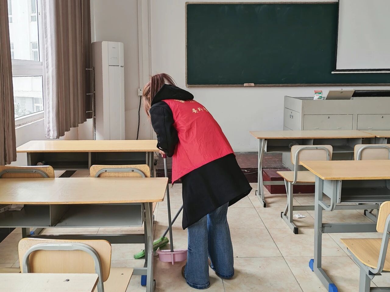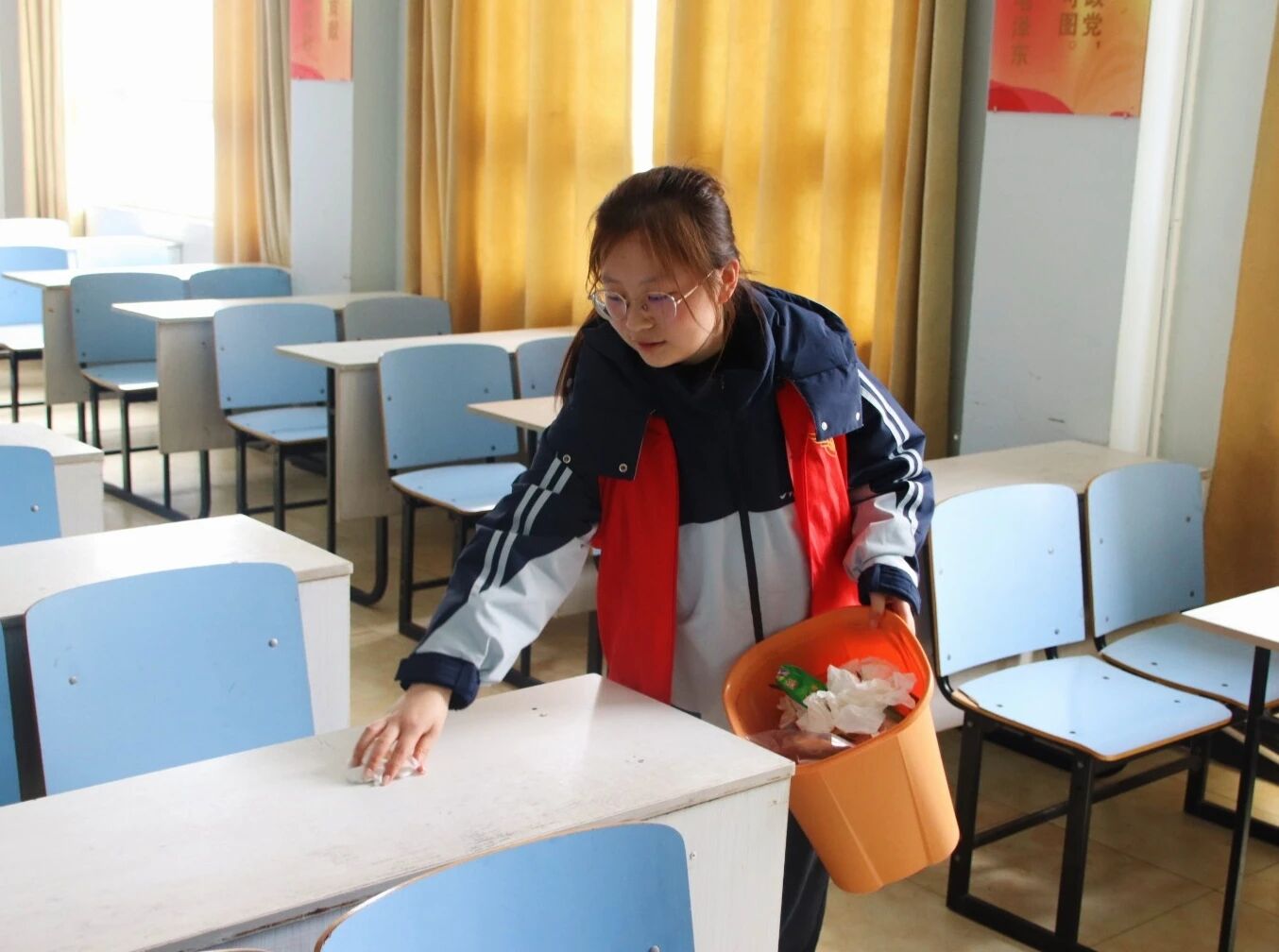 启动仪式后,志愿者们身着统一志愿马甲,携带扫帚、抹布等清洁工具,有序奔赴国经教学楼各责任区域,迅速投入环境整治工作。大家分工协作、配合默契,从教室桌椅的细致擦拭,到黑板门窗的全面清洁,再到地面及卫生死角的彻底清扫,不放过任何一处盲区,不留下一丝隐患,切实提升了教学楼整体环境卫生水平。活动中,志愿者们以认真负责的态度、主动担当的作风,充分展现了新时代青年学子乐于奉献、团结协作、锐意进取的优良品质与精神风貌。
