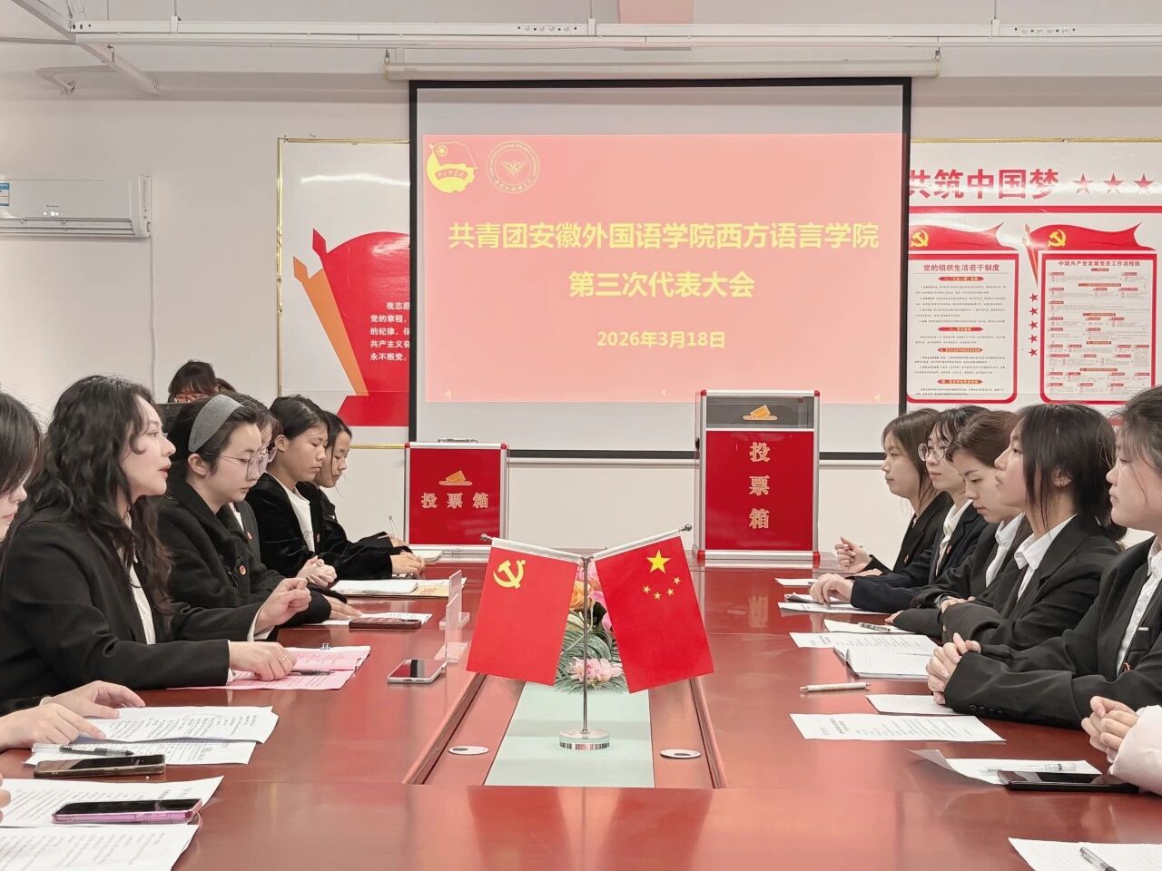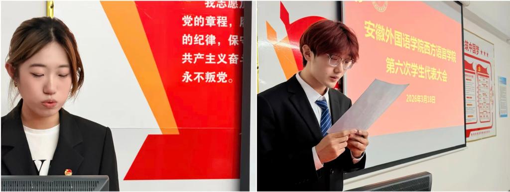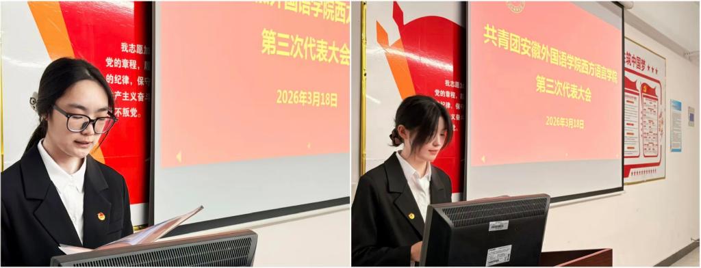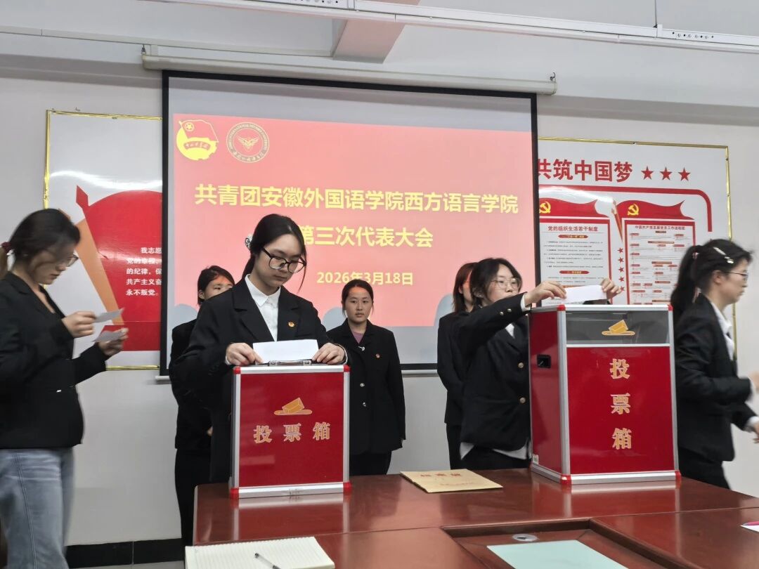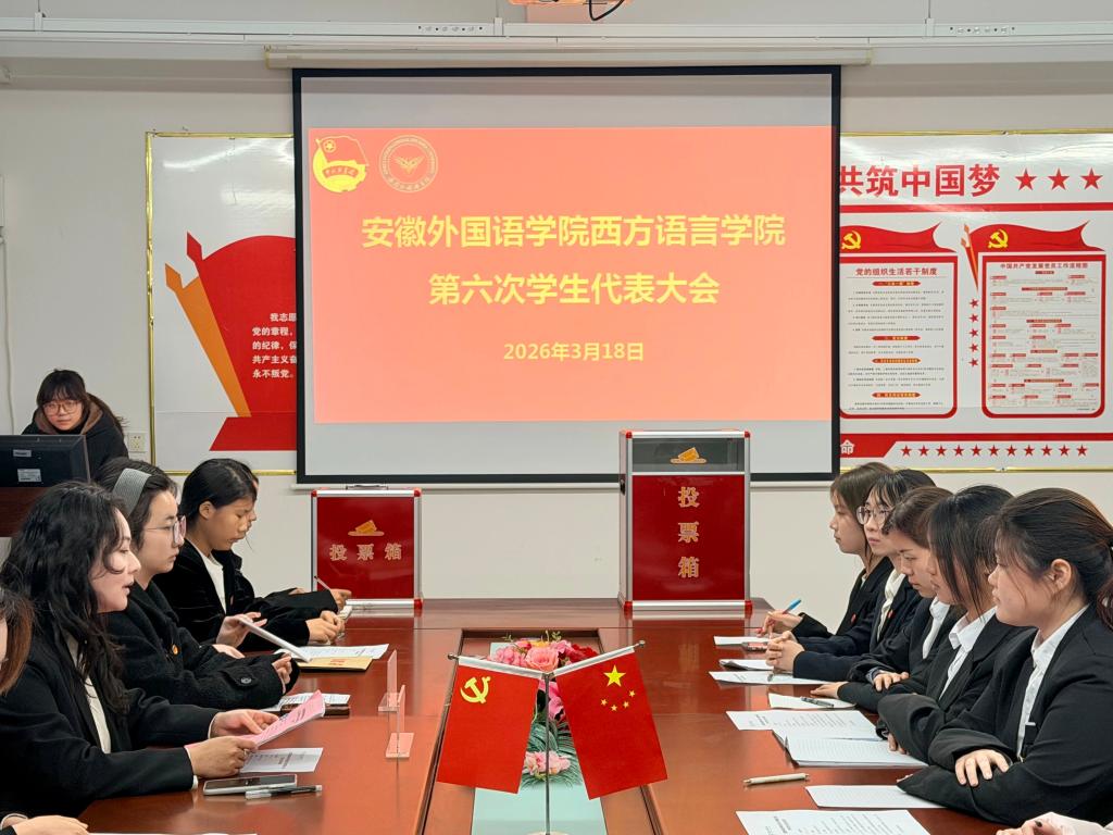 为深入学习贯彻习近平新时代中国特色社会主义思想,落实青年工作要求,进一步加强学院共青团和学生会组织建设,凝聚青年力量、服务同学成长,3月18日,共青团安徽外国语学院西方语言学院第三次团代会与第六次学代会在西语301会议室召开。本次团学两代会由西方语言学院团总支书记张叶琳主持,校团委副书记詹雅雯莅临指导,学院全体团学代表参加会议。
