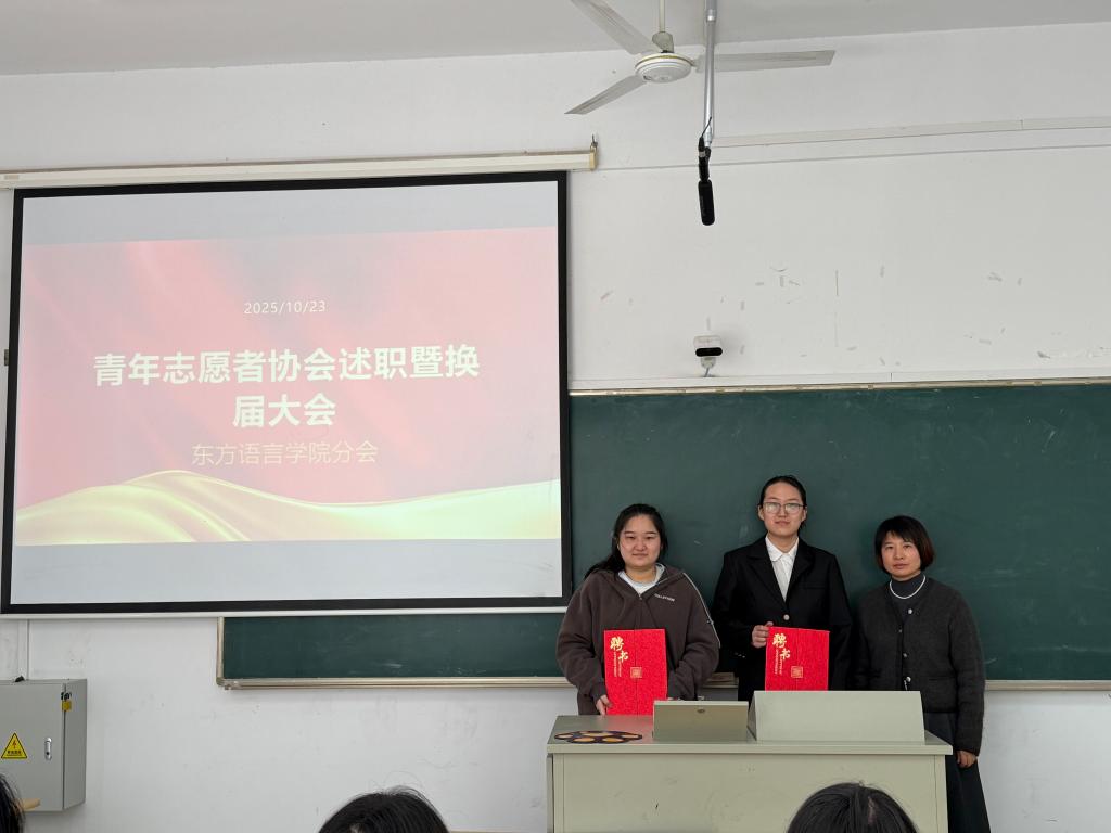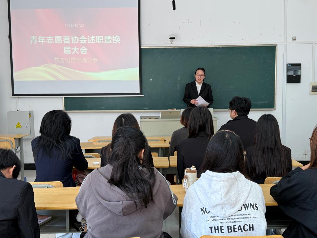 为传承志愿服务精神,推动协会持续发展,青年志愿者协会(东语分会)于10月23日在东语202教室召开述职暨换届大会。东方语言学院党总支副书记刘法英、东方语言学院团总支书记孙文参会。