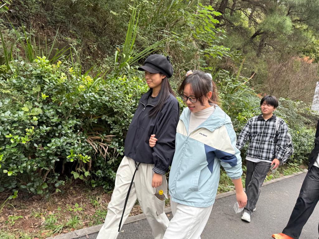 活动开始前,同学们在学校指定地点集合。在孙文老师强调了安全事项与活动流程后,大家合影留念,统一步行前往紫蓬山。秋高气爽,山色斑斓,同学们沿着预设路线缓步登山,沿途欣赏秋景,交流校园生活趣事,分享“最近让自己开心的小事”,在轻松愉快的氛围中逐渐释放学业压力,缓解焦虑情绪。