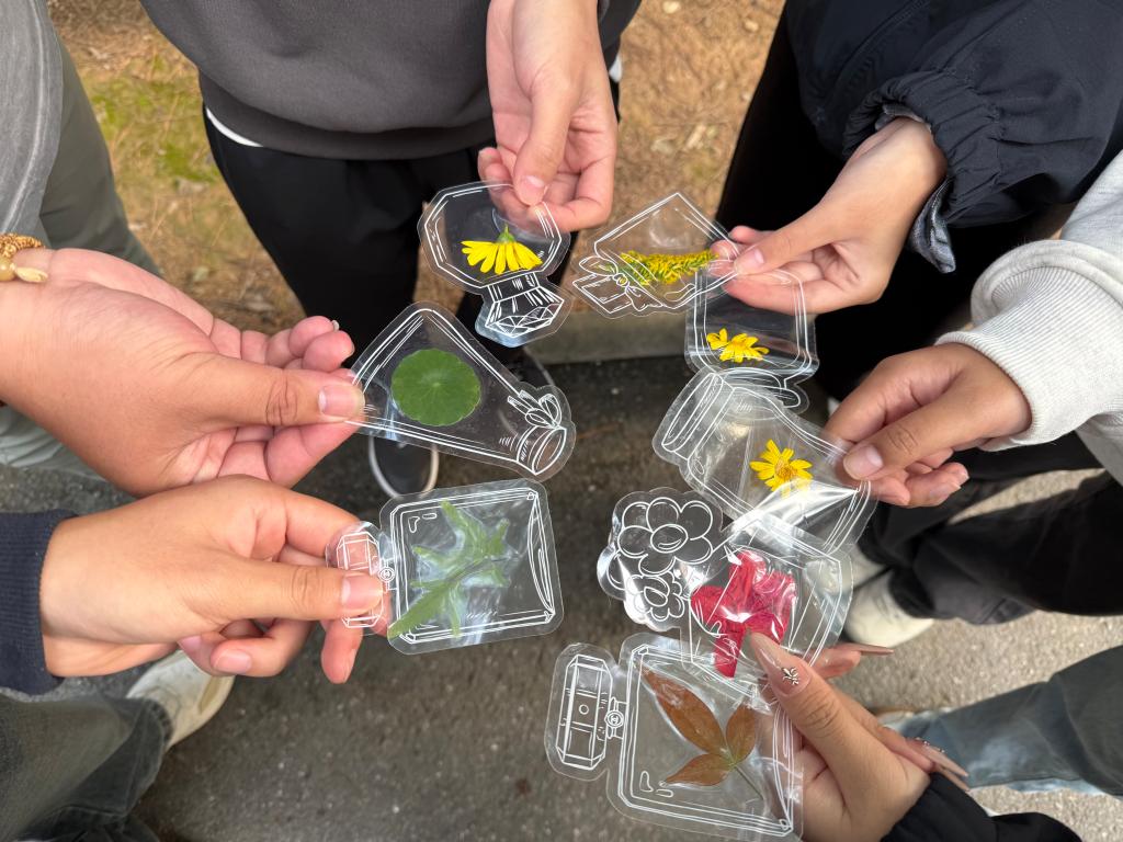 登山结束后,活动进入“拾叶创作”环节。同学们捡拾地面上自然掉落的树叶,在透明书签里进行创作,将内心的感受与自然元素相结合,以艺术的方式表达情绪。这一过程不仅锻炼了学生的观察力与创造力,也帮助他们实现情绪的自我觉察与梳理。