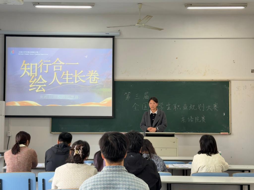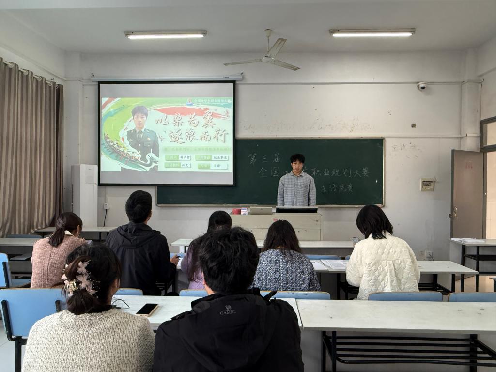 第三届全国大学生职业生涯规划大赛学院初赛于11月14日下午在东语201教室圆满落幕。本次比赛得到了学生的积极响应,全院报名参赛学生比例约75%,充分展现了我院学子对自身未来发展的深切关注与科学规划的高度热情。