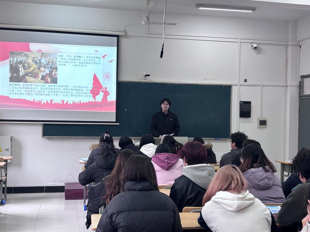随后,团总支组织委员舒灏禹围绕“薪火相传学雷锋,挺膺担当建新功”主题开展系统学习。从雷锋苦难的童年与在党和政府关怀下的新生,到参加工作后积极进取、屡获荣誉,再到光荣参军、入党后践行奉献直至因公殉职,舒灏禹细致讲解了雷锋同志短暂而光辉的一生,让大家对雷锋的成长历程有了全面了解。同时,深入解读了雷锋的“钉子精神”“螺丝钉精神”、集体主义观念及助人为乐的高尚品格,还结合郭明义、庄仕华、孙茂芳等当代雷锋式模范人物的事迹,阐明“时代在变,雷锋精神不变”的深刻道理,让大家深刻感受到雷锋精神在新时代的传承与发扬。