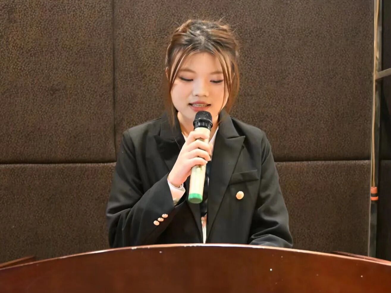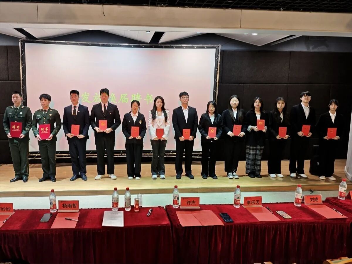 国旗护卫队与国防连全体同学在杨雨哲同学带领下进行宣誓。誓言铿锵有力,展现出队员们守护国旗、践行使命的赤诚初心与坚定信念。随后,主持人宣读换届聘书名单,同学们依次上台领取聘书。