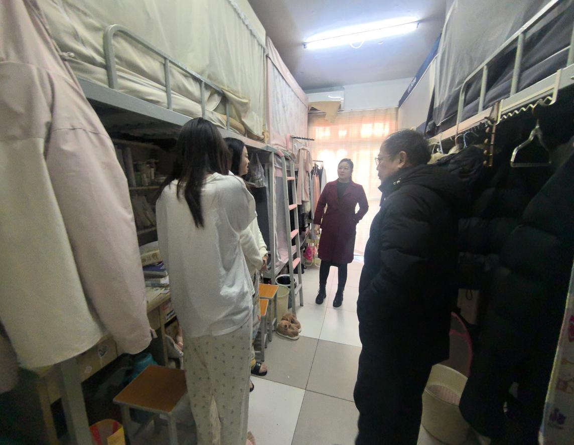寒假将至,为贯彻落实学校《关于做好2025-2026学年第一学期期末和寒假学生工作的通知》精神,切实保障学生离校期间宿舍安全与整洁,1月20日,英语语言学院院长周平、党总支副书记韩璐带领学工秘书及全体辅导员深入学生宿舍,开展学生宿舍假前走访慰问以及假期安全教育。