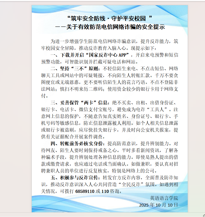 筑牢安全防线·守护平安校园——关于有效防范电信网络诈骗的安全提示