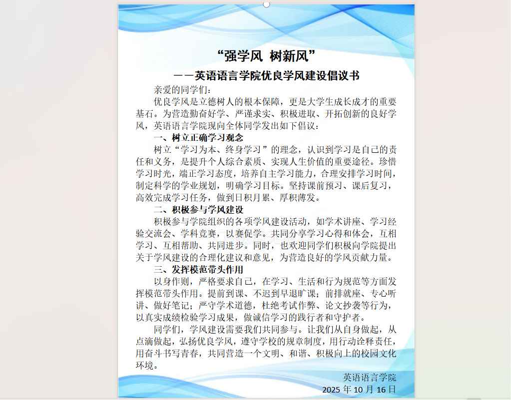 强学风 树新风——英语语言学院优良学风建设倡议书