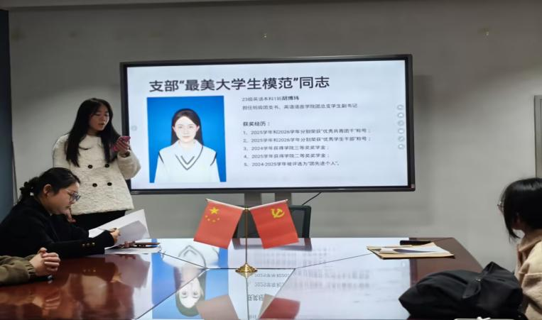 为教育引导广大学生坚定理想信念、厚植家国情怀、勇担历史使命,根据《教育部办公厅等七部门关于开展全国高校“立报国强国大志向 做挺膺担当奋斗者”宣传教育的通知》(教思政厅函〔2025〕17号)的文件要求,11月17日,英语语言学院学生第一党支部在西语101会议室召开“学习最美大学生 汲取青春奋进力”主题教育专题党课。本次会议由党支部书记叶雨晴主持,支部全体党员参加。