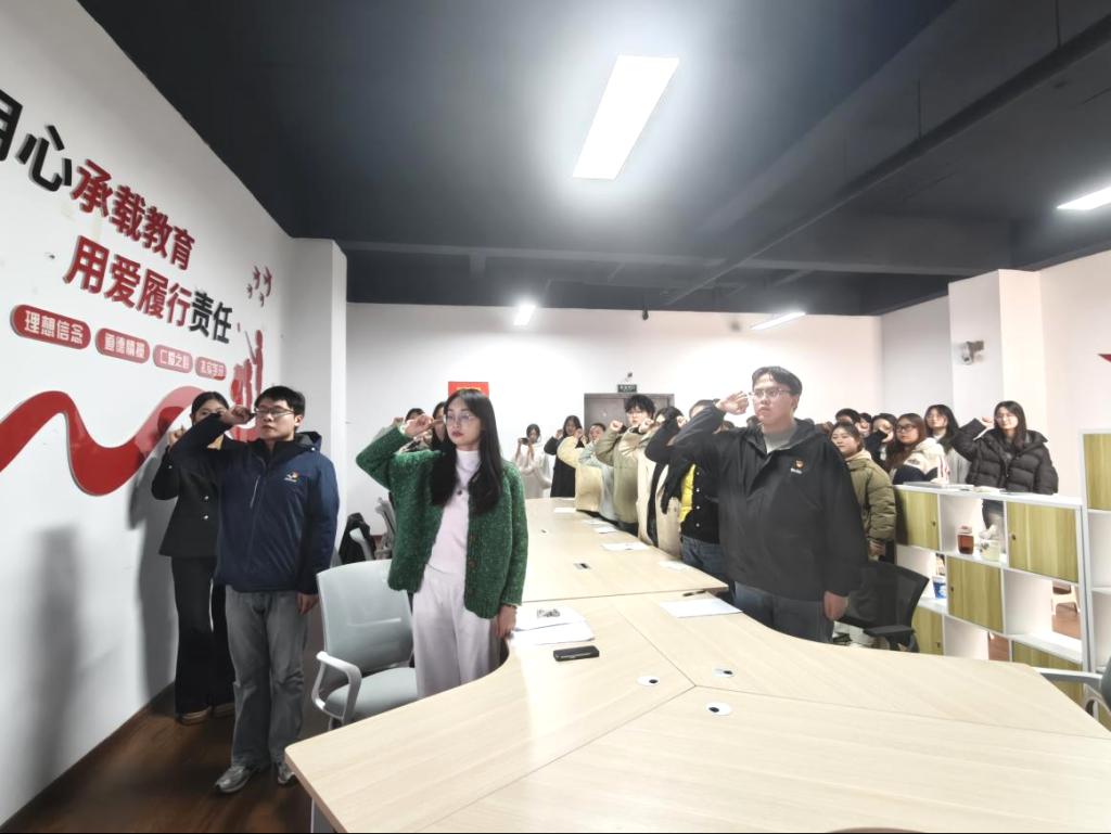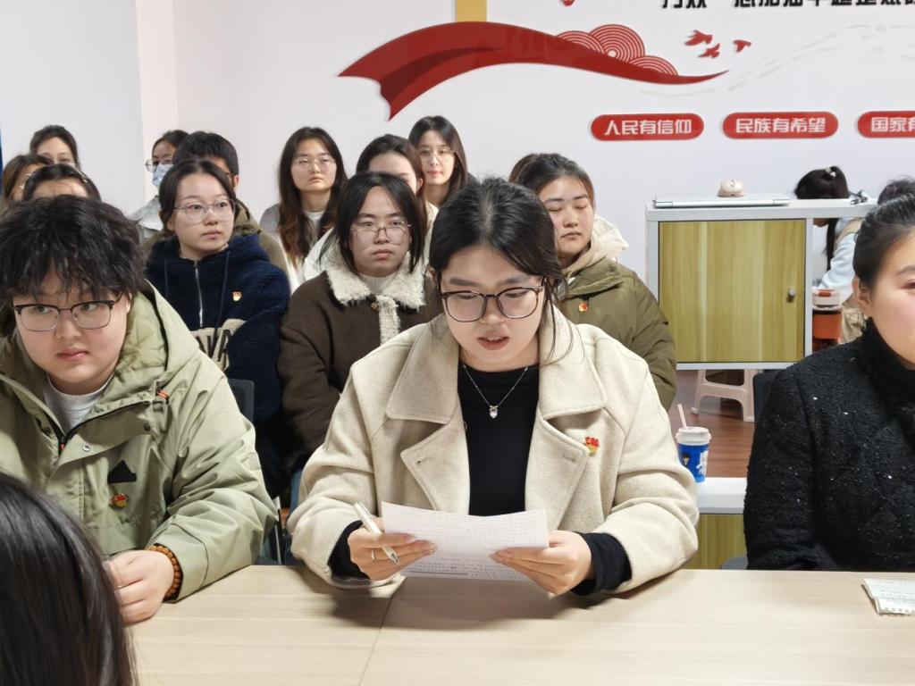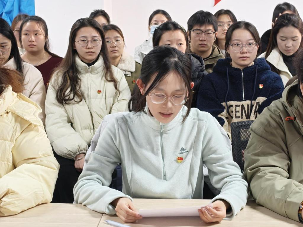 最后,王雪为本次活动作总结致辞。她对同学们在活动中的表现给予充分肯定,并从理论和实践层面为同学们的党史学习锚定了实践方向,鼓励同学们将所学所感转化为实际行动,在学习和生活中践行入党誓词。“我志愿加入中国共产党,拥护党的纲领,遵守党的章程……”铿锵有力的宣誓声在活动室回荡,新老党员们的声音交织在一起,彰显着代代相传的坚定信念与责任担当。