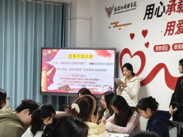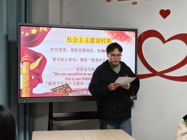 主题宣讲中,汪梦琴、张梦林、陈强、刘媛媛4位同学以大革命时期、抗战与解放战争时期、社会主义建设时期、改革开放以来四个历史时期为线索,系统梳理了入党誓词的演变历程。从强调“忠诚”“不怕牺牲”到突出“为共产主义奋斗到底”,从聚焦“投身社会主义建设”到规范化强调“党性修养与纪律意识”,每一次变化都映射着时代背景与党的使命担当。宣讲中穿插的双语金句展示,让党员同志们在中英文交融中更深刻地理解党的精神内涵。