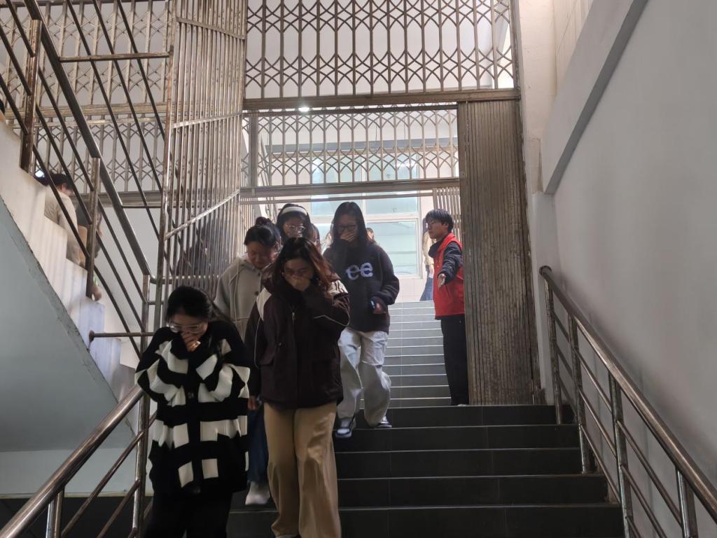 消防应急疏散暨灭火演练中,与安全管理处协同联动,经过严谨细致的筹备规划,力求逼真还原情境,全面检验应急预案的合理性与可操作性。在疏散引导员的镇定指挥下,参演师生迅速响应,纷纷用湿毛巾捂住口鼻、弯腰低身,沿着既定疏散路线,从教学楼西侧经四教,快速且有序地向集结地撤离。所有新生全部参加,均在限定时间内安全抵达指定地点,充分彰显出卓越的应急处置能力。
