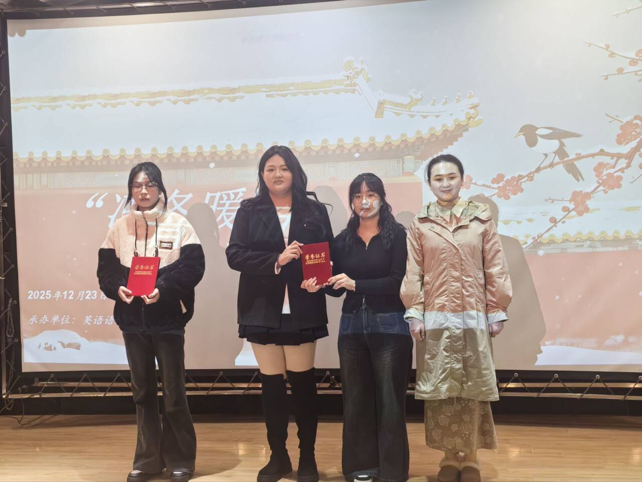 比赛在外教Tony老师自弹自唱的英文暖场歌曲中拉开帷幕,动人的旋律迅速点燃全场热情,也为选手们送上真挚鼓励。随后,各组选手依次登台,以歌声传递情感,以表演演绎风采。评委们在每组演出后均给予精准而专业的点评,尤其对选手的英语发音、情感表达与舞台表现力提出了中肯建议。英语合唱团指导老师徐桢为一等奖获得者颁奖,翻译系主任陈君为二等奖获得者颁奖,外教Tony老师为三等奖获得者颁奖。选手们手持证书,绽放笑容,现场掌声与欢呼持续不断。