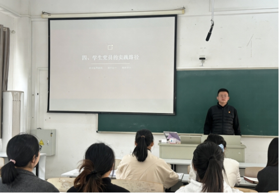 胡礼盼紧扣“政绩为谁而树、树什么样的政绩、靠什么树政绩”这一根本问题,结合学习材料与青年党员成长实际,从三个维度系统阐释正确政绩观的核心要义。党课结合青年党员身份特点明确指出,学生党员树立和践行正确政绩观,起决定性作用的是党性修养,要始终把为民服务、奉献集体、助力成长作为根本价值取向,摒弃功利主义、浮躁心态;要树牢立足学业、服务同学、担当使命的实绩导向,以扎实学好专业知识、用心参与支部建设、真心服务身边师生、积极投身社会实践为政绩,杜绝形式主义、敷衍应付等不良风气;在实践路径上,要坚持实事求是、脚踏实地,尊重成长规律与学习规律,以实干担当锤炼本领,坚决反对急功近利、弄虚作假、盲目跟风等错误倾向,把正确政绩观内化于心、外化于行,融入日常学习、支部工作与个人成长的全过程。