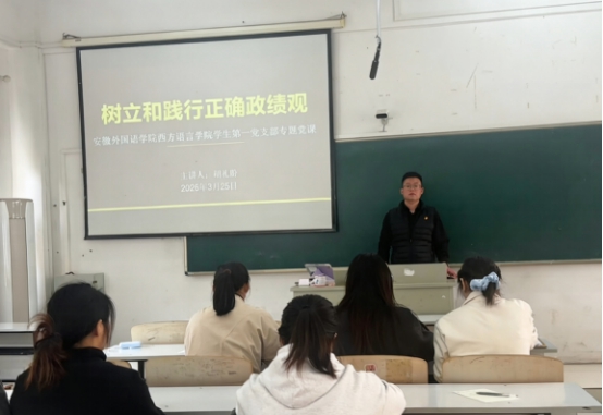 为深入学习贯彻习近平新时代中国特色社会主义思想,引导学生党员牢固树立和践行正确政绩观,3月25日,西方语言学院学生第一党支部组织开展树立和践行正确政绩观学习教育专题党课。本次党课由支部书记胡礼盼主讲,全体学生党员参加学习。