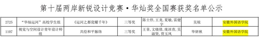 11月25日,由中国高等教育学会、中华中山文化交流协会、北京歌华文化发展集团联合主办的第十届两岸新锐设计竞赛·华灿奖公布国赛获奖名单。自竞赛公告发布以来,经过5个月的作品征集,共收到来自海峡两岸暨香港、澳门1200余所高校及单位的12万余参赛作品。经赛区赛评审推荐、全国赛线上初评、会议终评及公示,安徽外国语学院师生在本届大赛中共斩获安徽赛区奖10项和全国奖2项,其中全国赛获奖的2项均为三等奖;生动诠释了“以设计促融合”的赛事理念。国赛获奖信息如下: