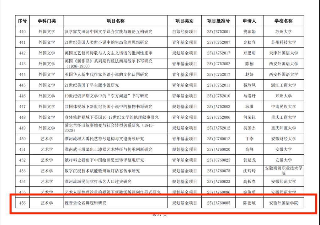 近日,安徽外国语学院文学与艺术传媒学院中文系教授陈德琥申报的 “魏晋乐论名辩逻辑研究”(编号:25YJA760005)课题,在2025年度教育部人文社科项目的激烈竞争中脱颖而出,成功斩获立项资格。这一成果不仅是陈德琥个人在人文社科领域学术研究的重要突破,更标志着我院在教育部人文社科项目立项工作中实现“零的突破”,为学校科研事业发展树立了里程碑。