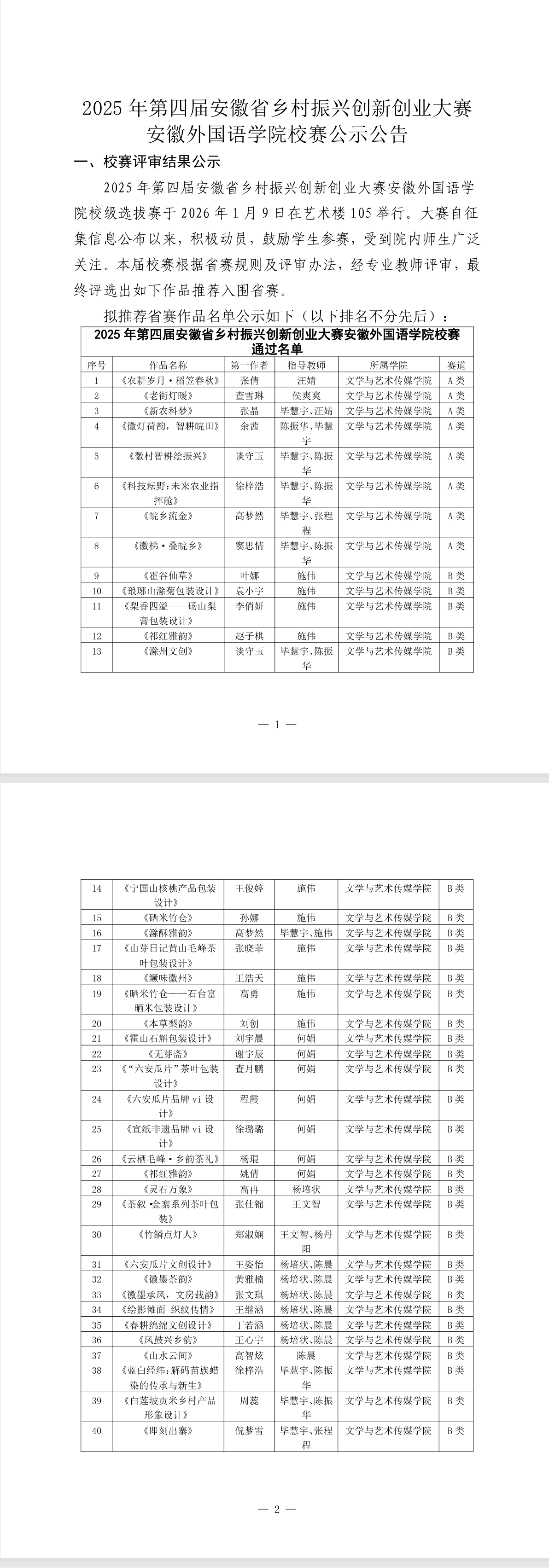 2025年第四届安徽省乡村振兴创新创业大赛安徽外国语学院校赛公示公告