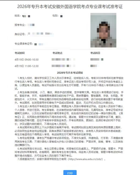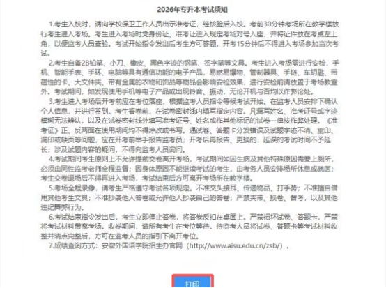 根据《安徽外国语学院2026年普通高校专升本招生章程》的有关要求,我校2026年普通高校专升本招生考试准考证打印将于4月15日12:00-4月18日24:00开放打印,请考生根据准考证打印流程自行打印专业课考试准考证,务必认真阅读准考证上相关信息。