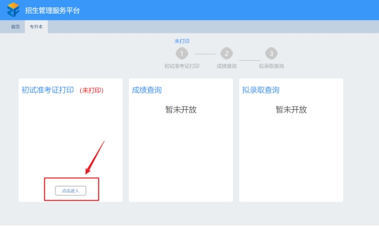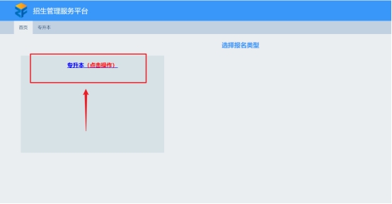 2. 按照提示输入姓名、身份证号(有X大写)和验证码登陆系统。进入系统后点击下方菜单“专升本(点击操作)”,进入准考证打印页面。